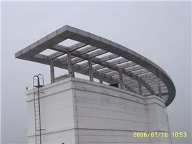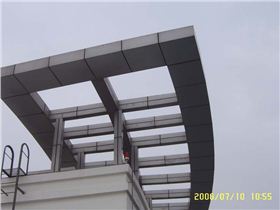 飘棚结构形式一般取H型钢结构、网架结构等。形成结构后在结构外部搭设龙骨(方管,矩形管,角钢),外部包饰铝板或者铝塑板。