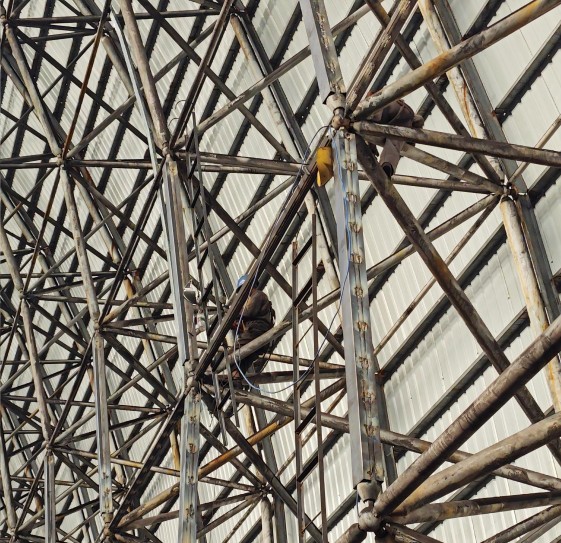 现场检测是网架加固过程中的基础环节,通过全面、细致的检测工作,能够深入了解网架结构的实际状况,为后续的加固设计和施工提供准确可靠的数据依据。现场检测涵盖了多个方面的内容,包括网架的整体结构布置、各杆件截面尺寸、节点相关参数、使用情况、锈蚀概况、防火与防腐涂料现状以及结构变形等情况。